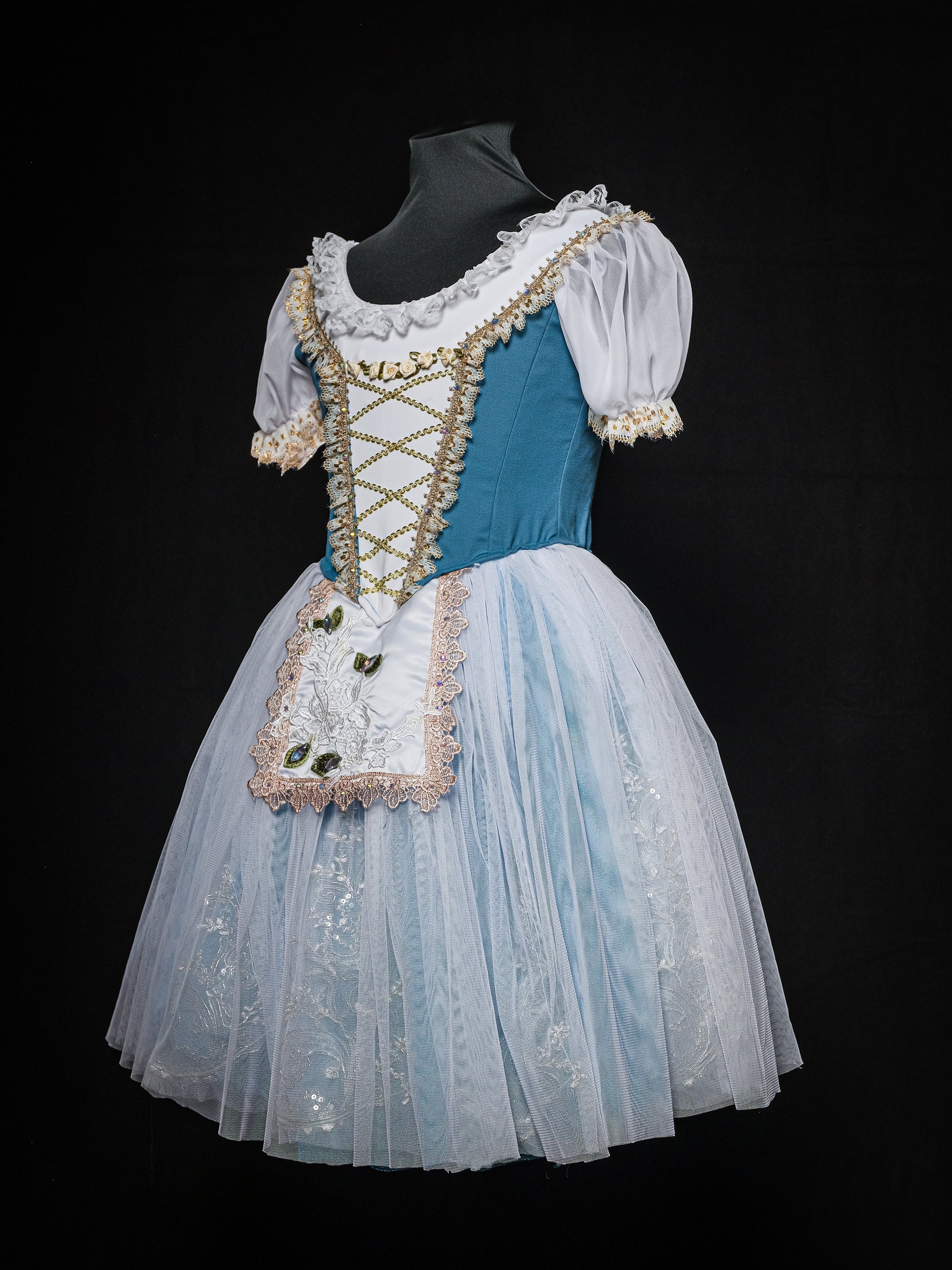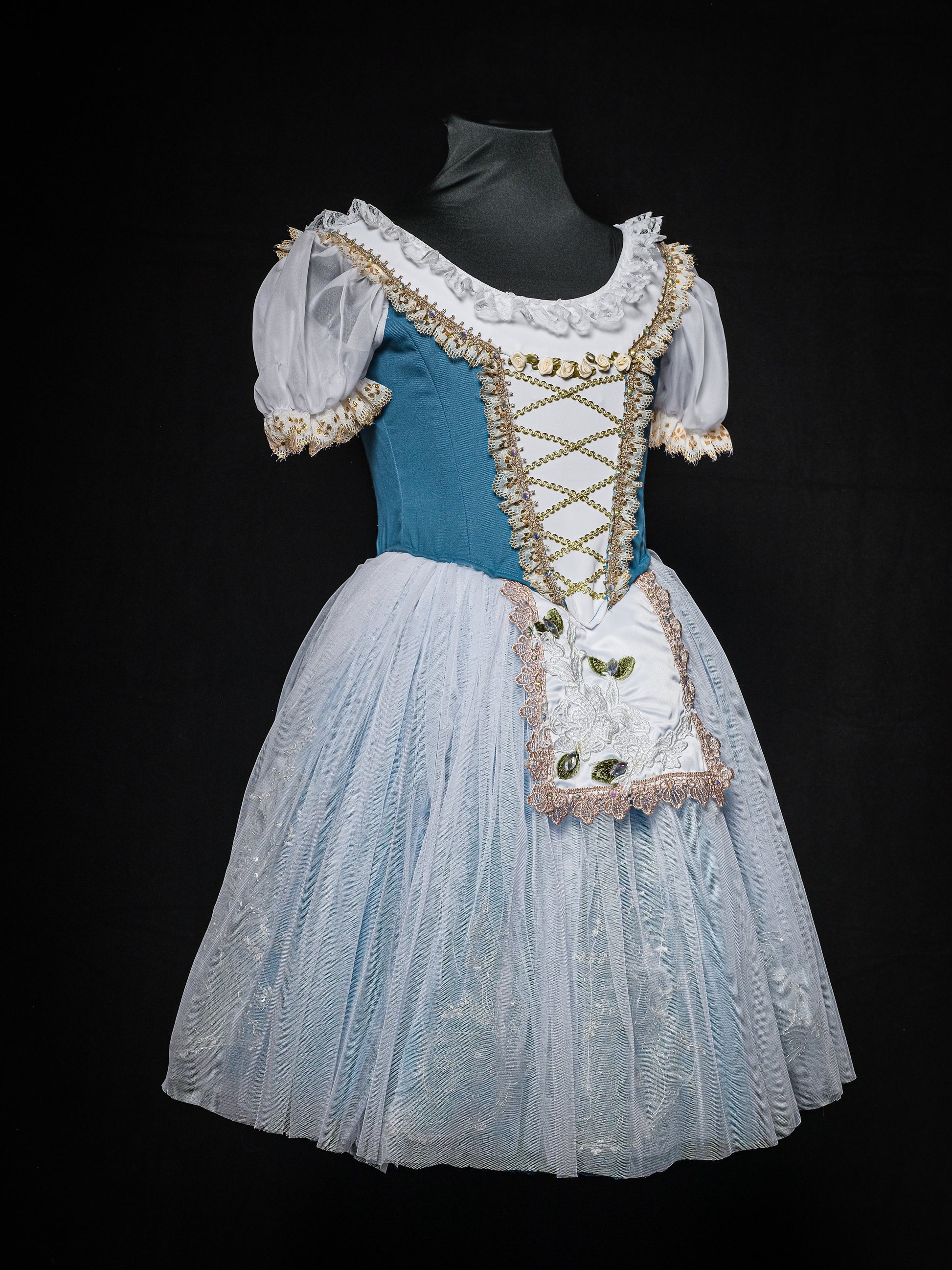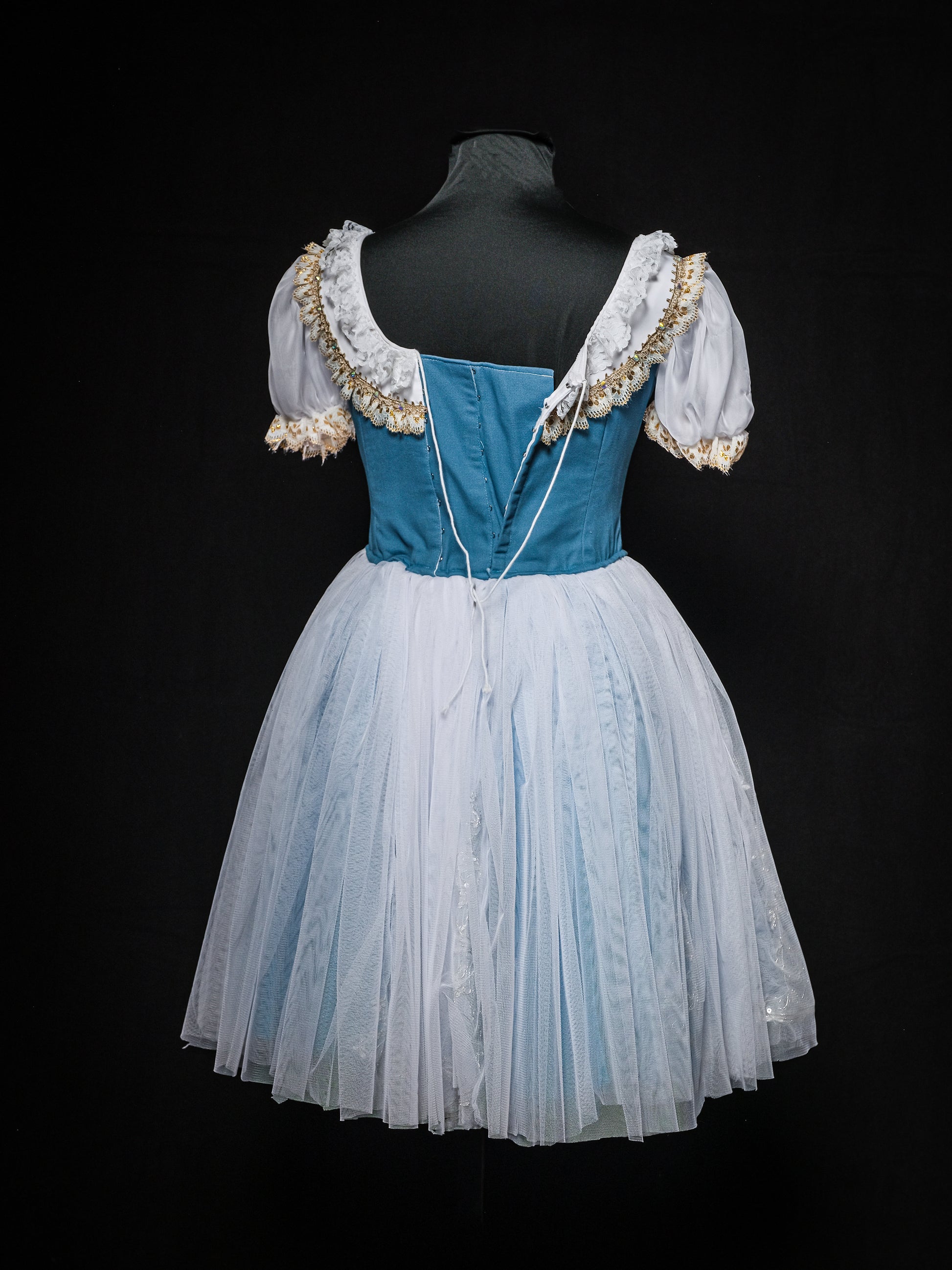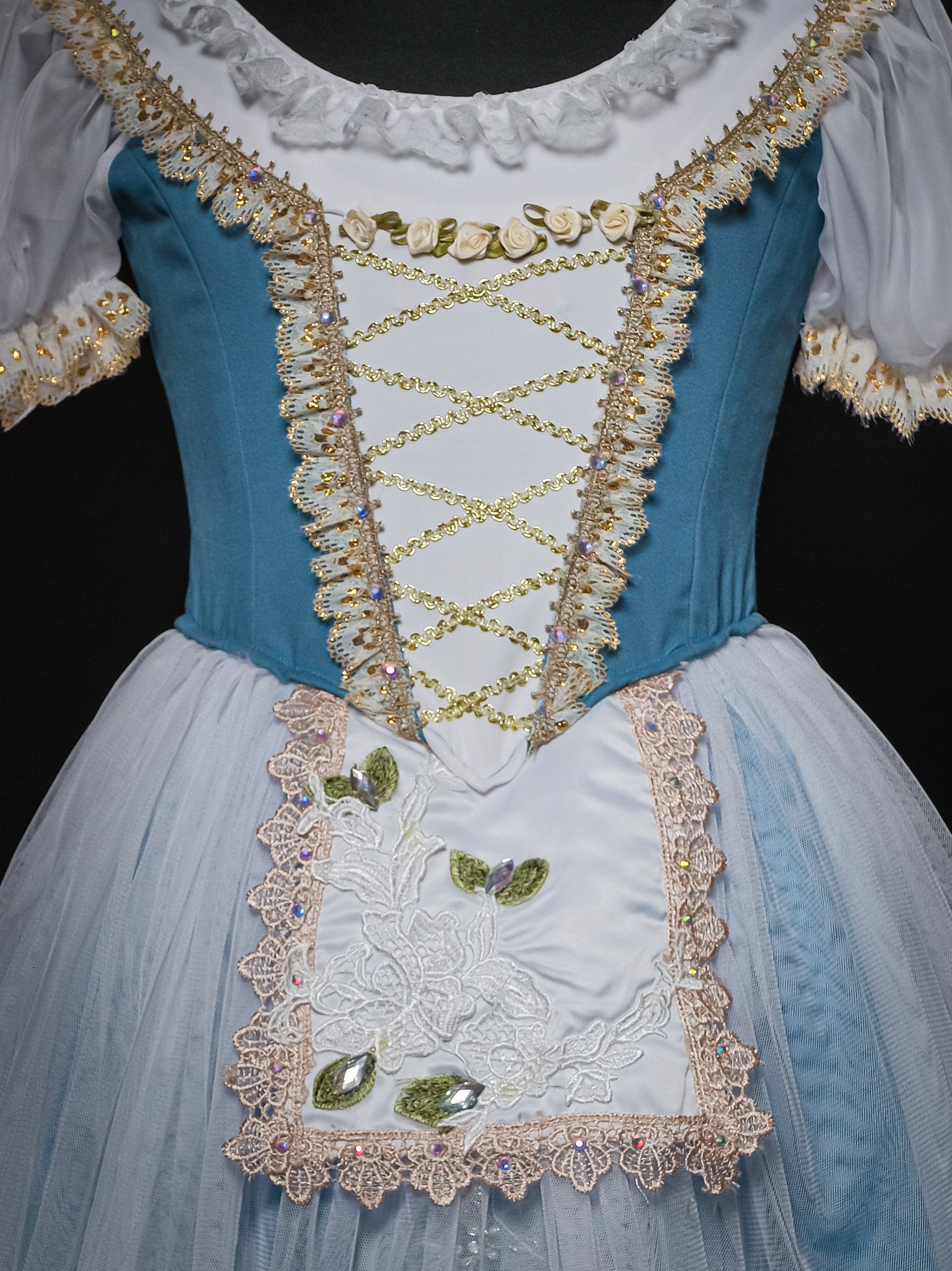 A blue and white peasant dress trimmed in lace forms its balanced silhouette, accented with floral touches that lend softness without excess. The tulle skirt floats over an appliqued underskirt that offers subtle texture and depth beneath the surface. A gold-trimmed white floral headband with ribbons is included and completes the look with a quiet, pastoral brightness.