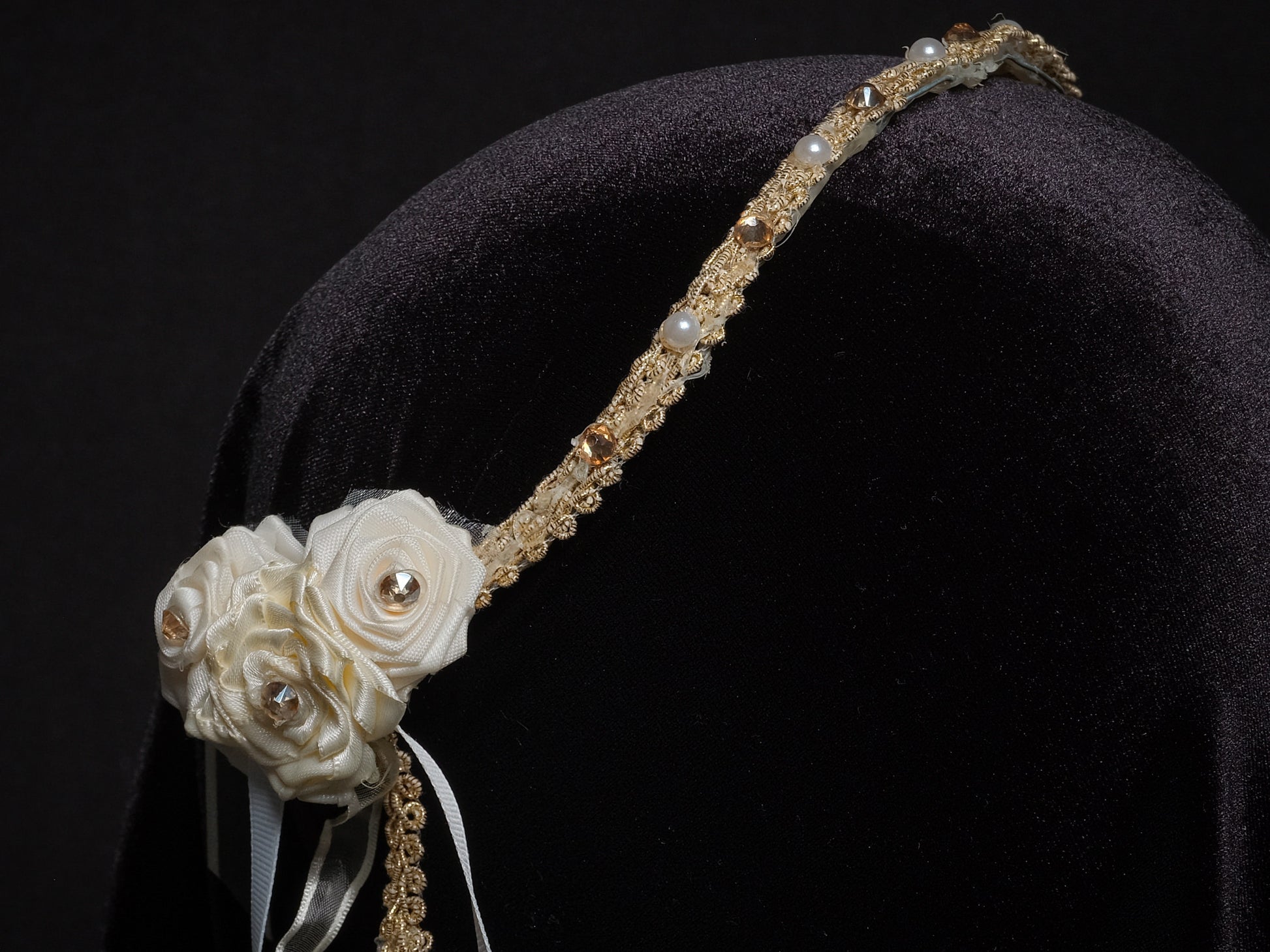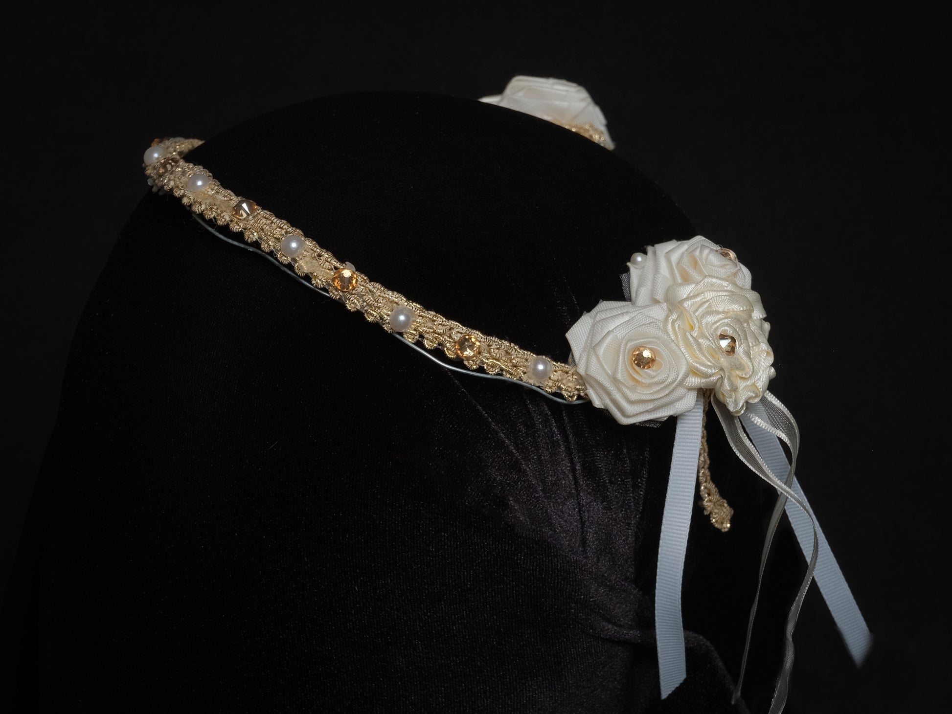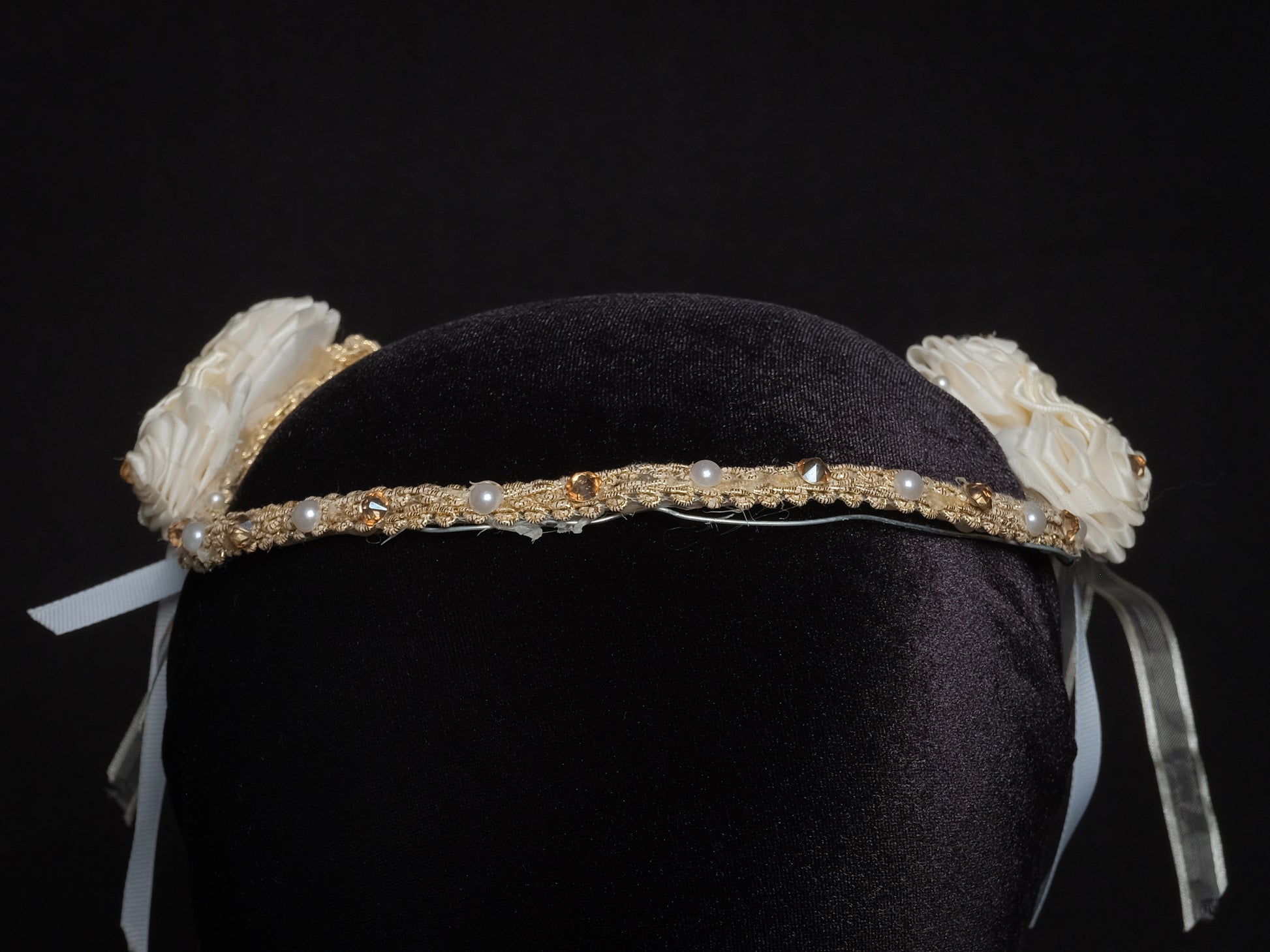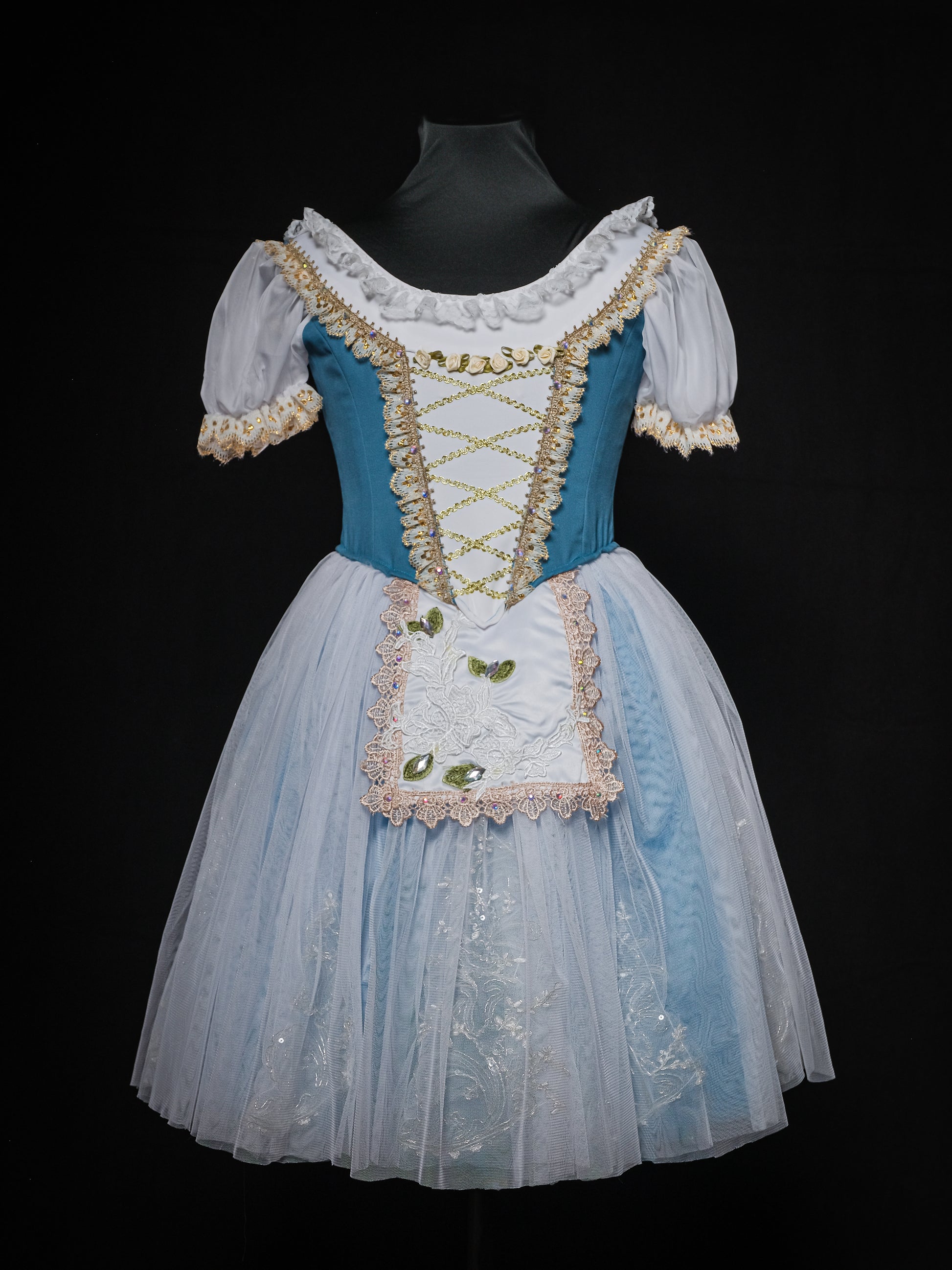 A blue and white peasant dress trimmed in lace forms its balanced silhouette, accented with floral touches that lend softness without excess. The tulle skirt floats over an appliqued underskirt that offers subtle texture and depth beneath the surface. A gold-trimmed white floral headband with ribbons is included and completes the look with a quiet, pastoral brightness.