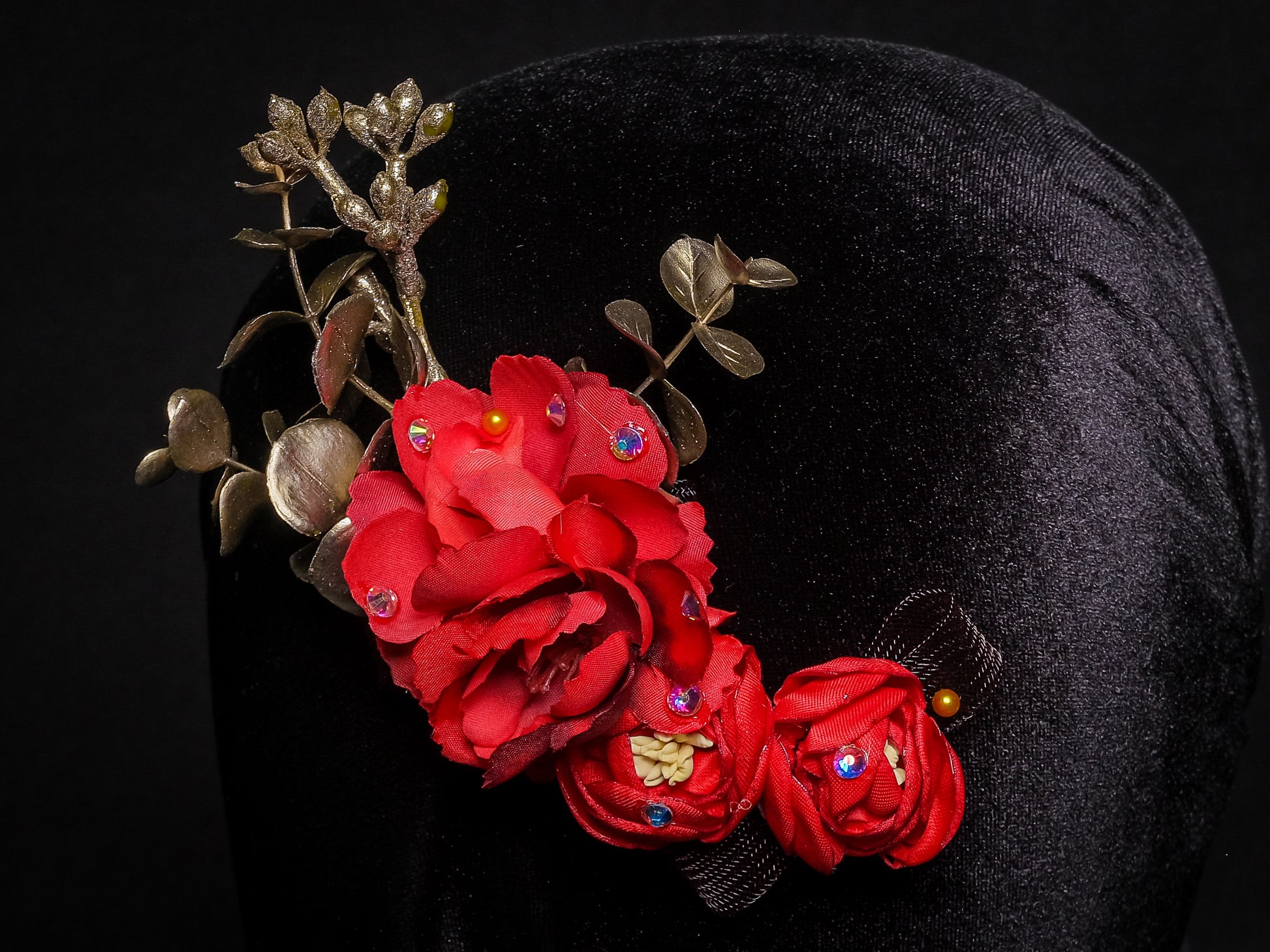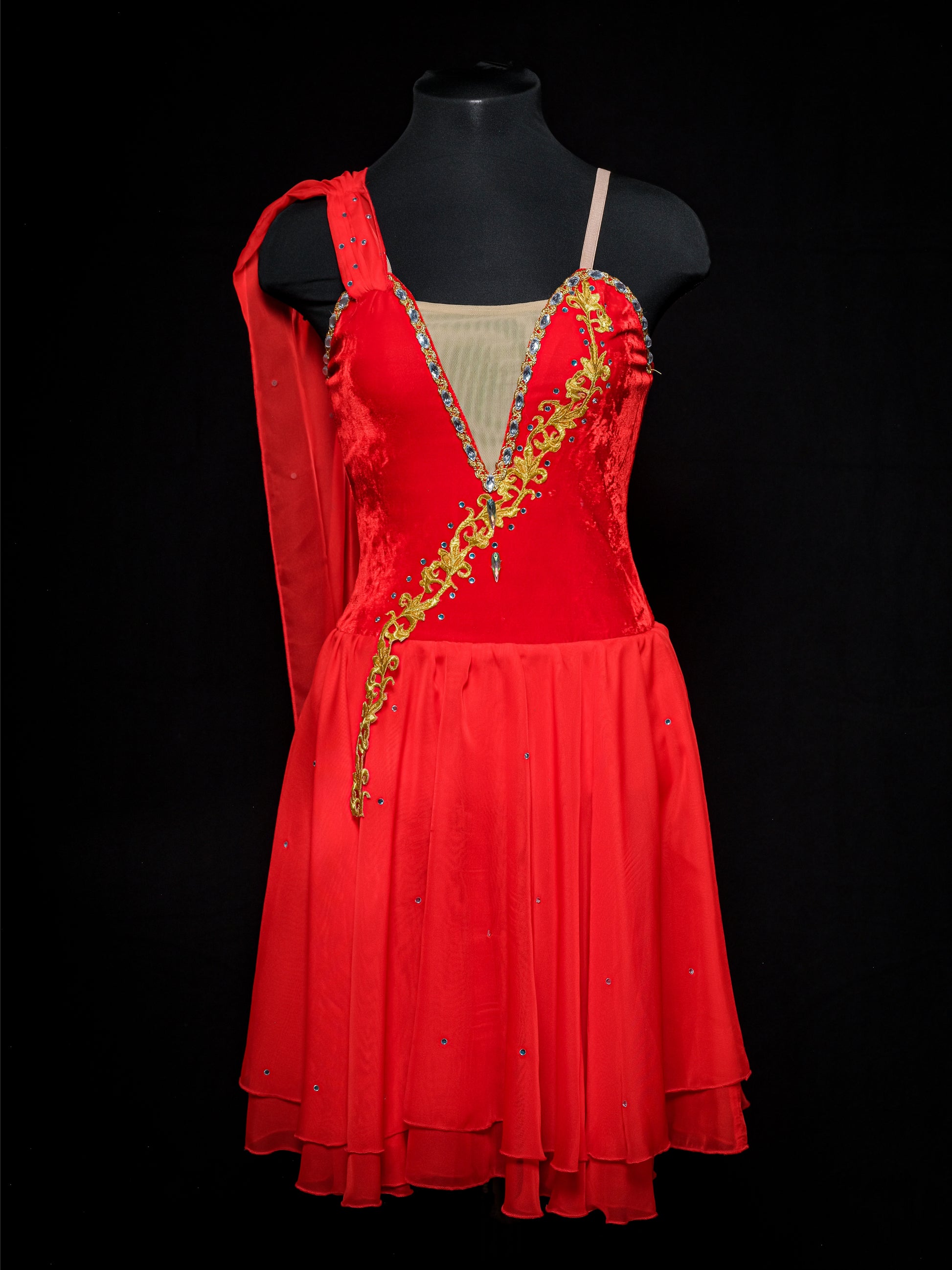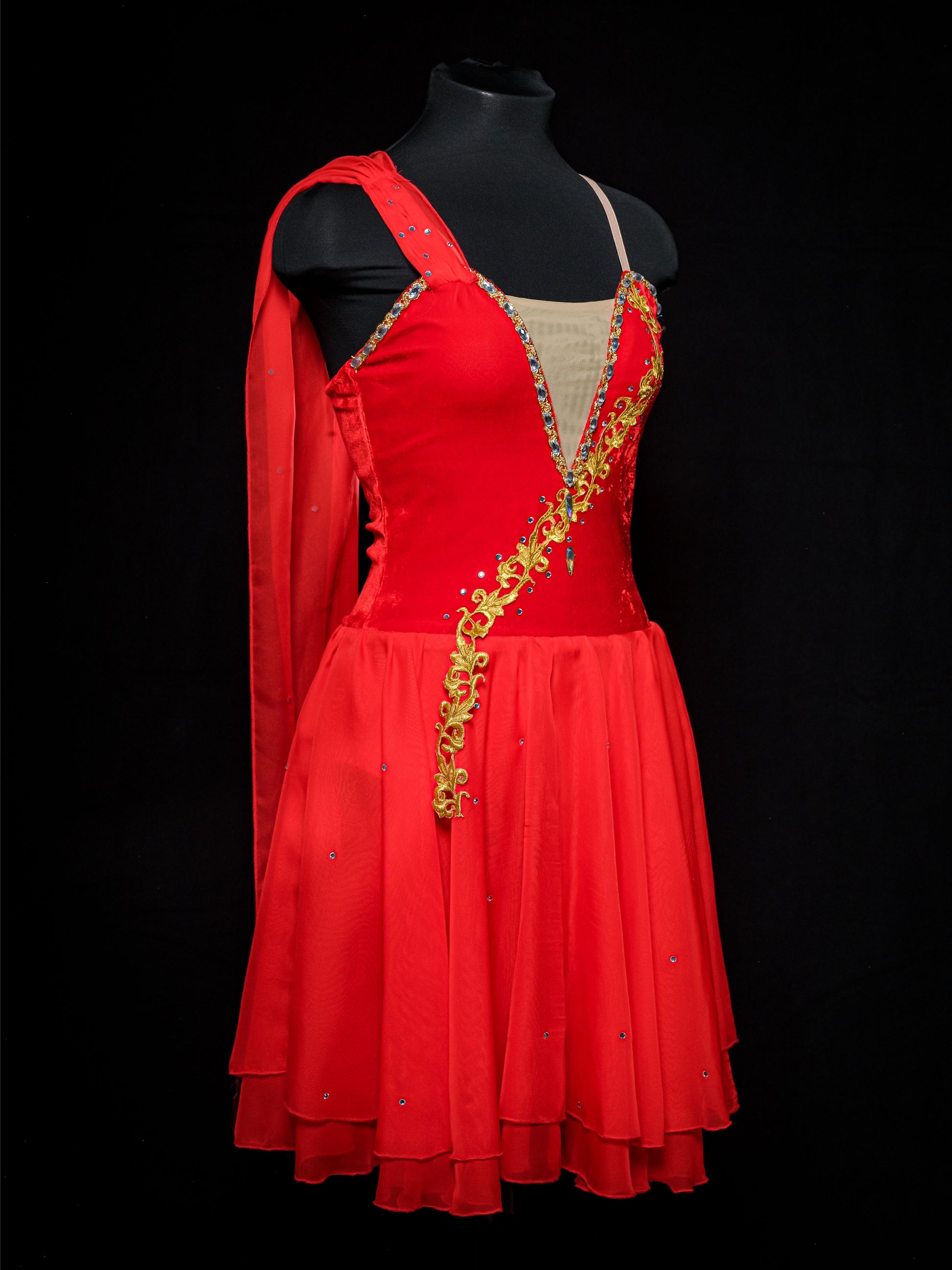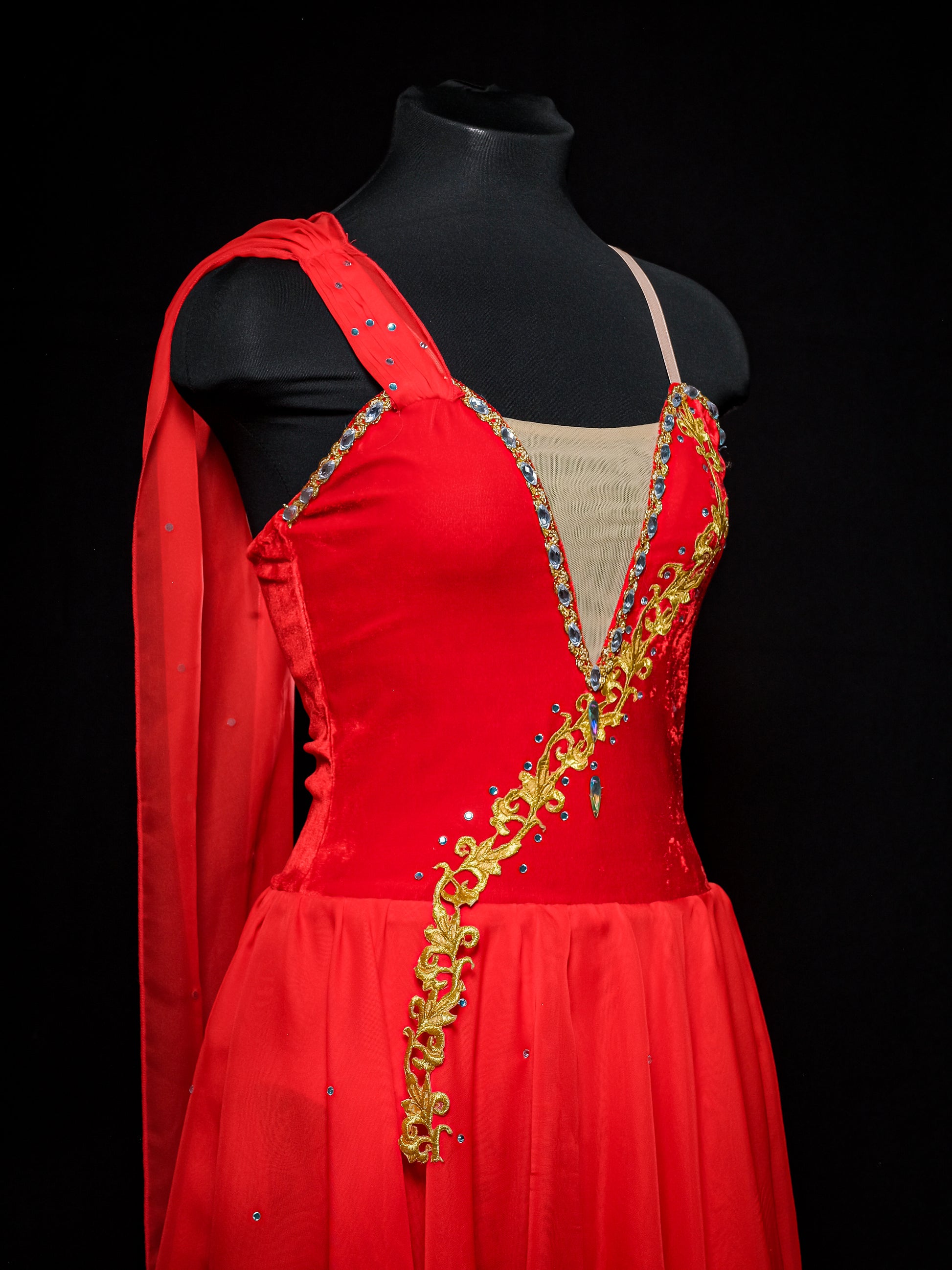 A red velvet leotard dress with a back zipper forms its sculpted base, layered with a double chiffon skirt that moves in clean, weightless arcs. A trailing chiffon scarf drapes from the right shoulder to extend its line in motion, while gold bodice trim and scattered crystals lend a controlled brilliance that catches the light without excess. A red floral hairpiece completes the design and carries its intensity through the final silhouette.