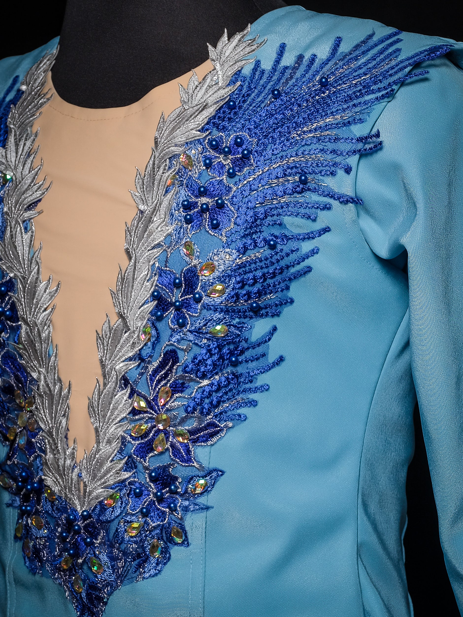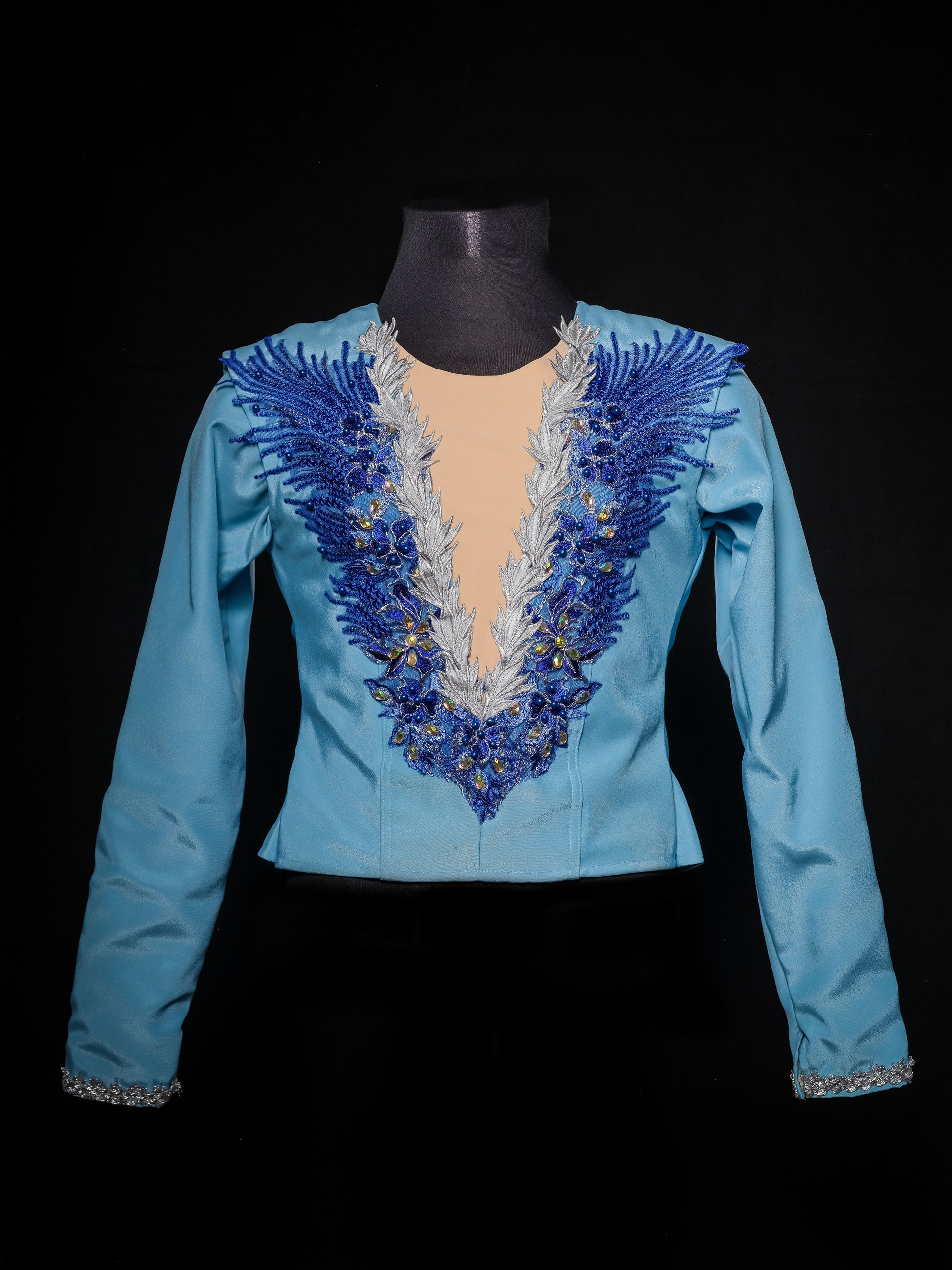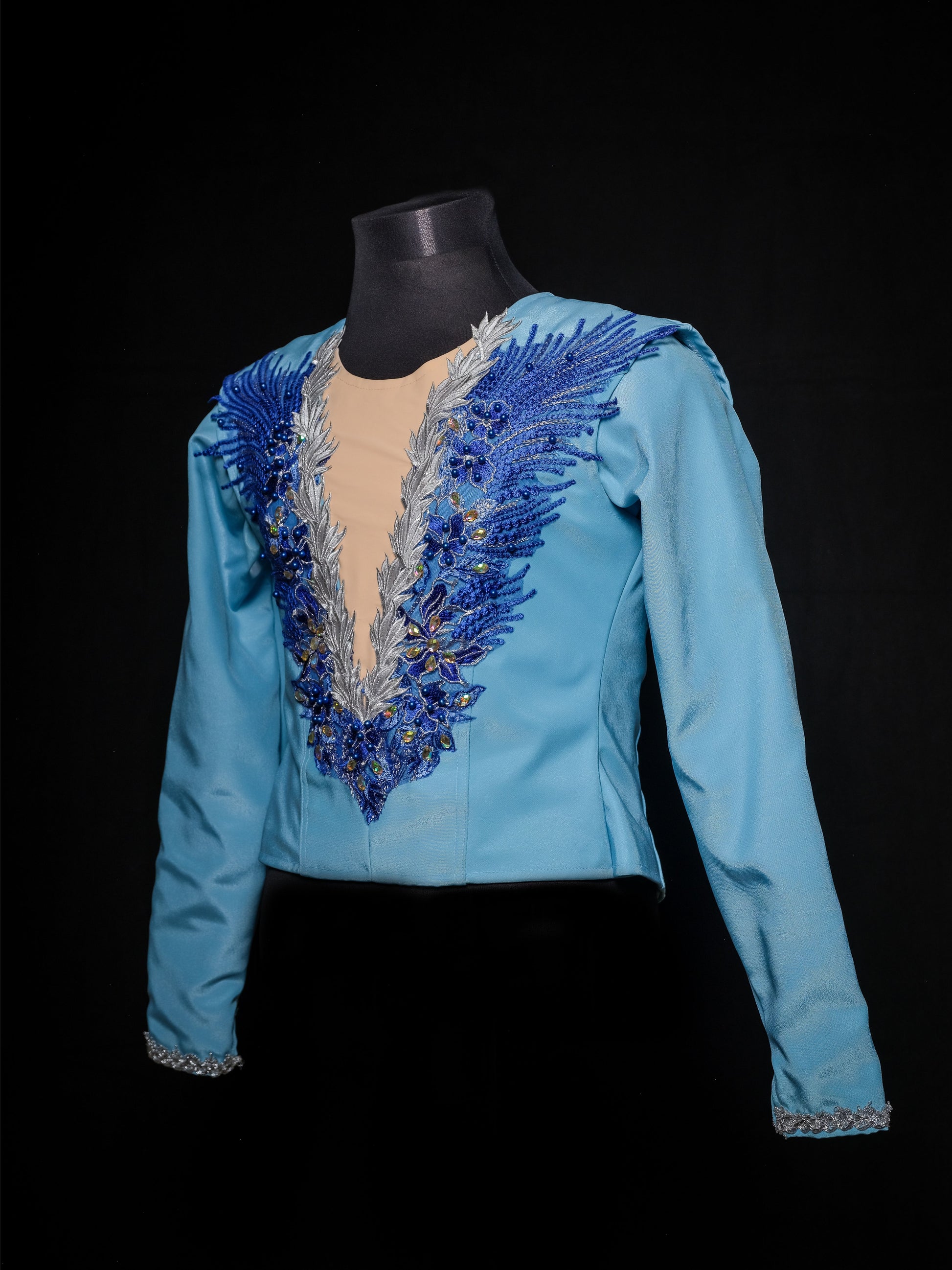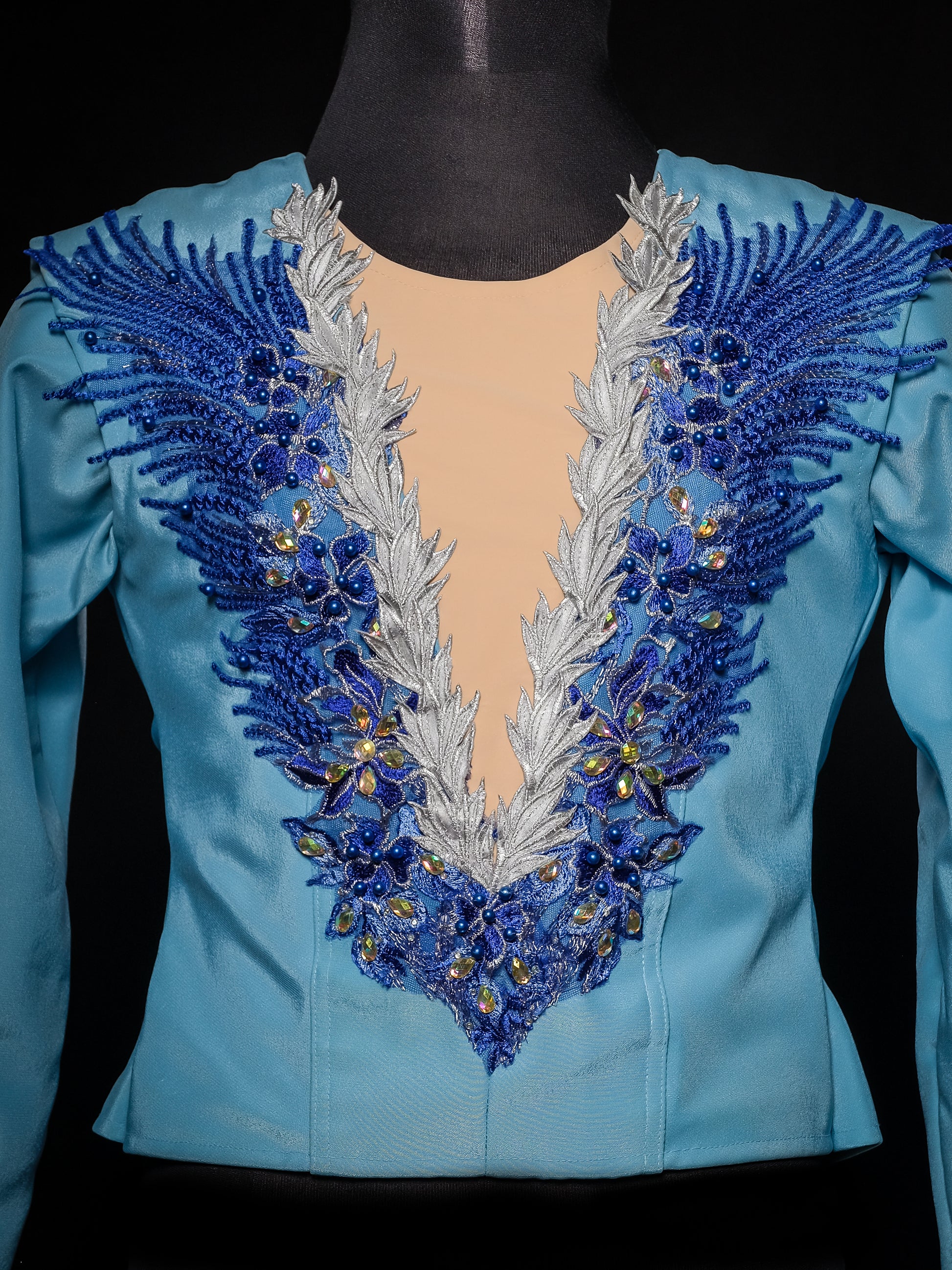 A light blue tunic forms the foundation, centered by a plunging front insert embroidered and beaded in a feathered motif that draws the line upward with focus and brightness. Separate sleeves preserve full range of motion and keep the silhouette clean during fast, intricate footwork and jumps. Blue tights and a royal blue feather headpiece is included and completes the look with a touch of vivid, aerial energy.