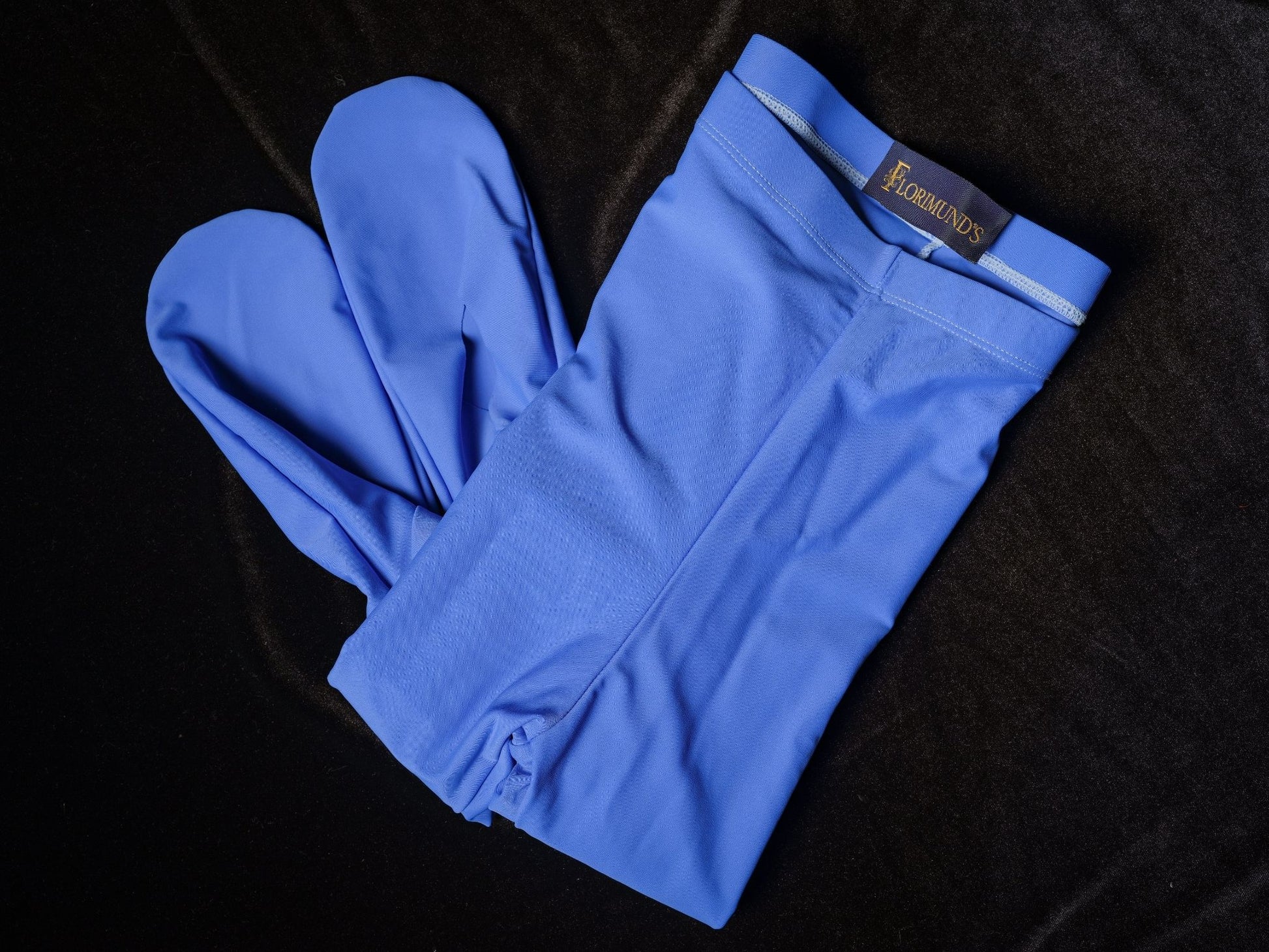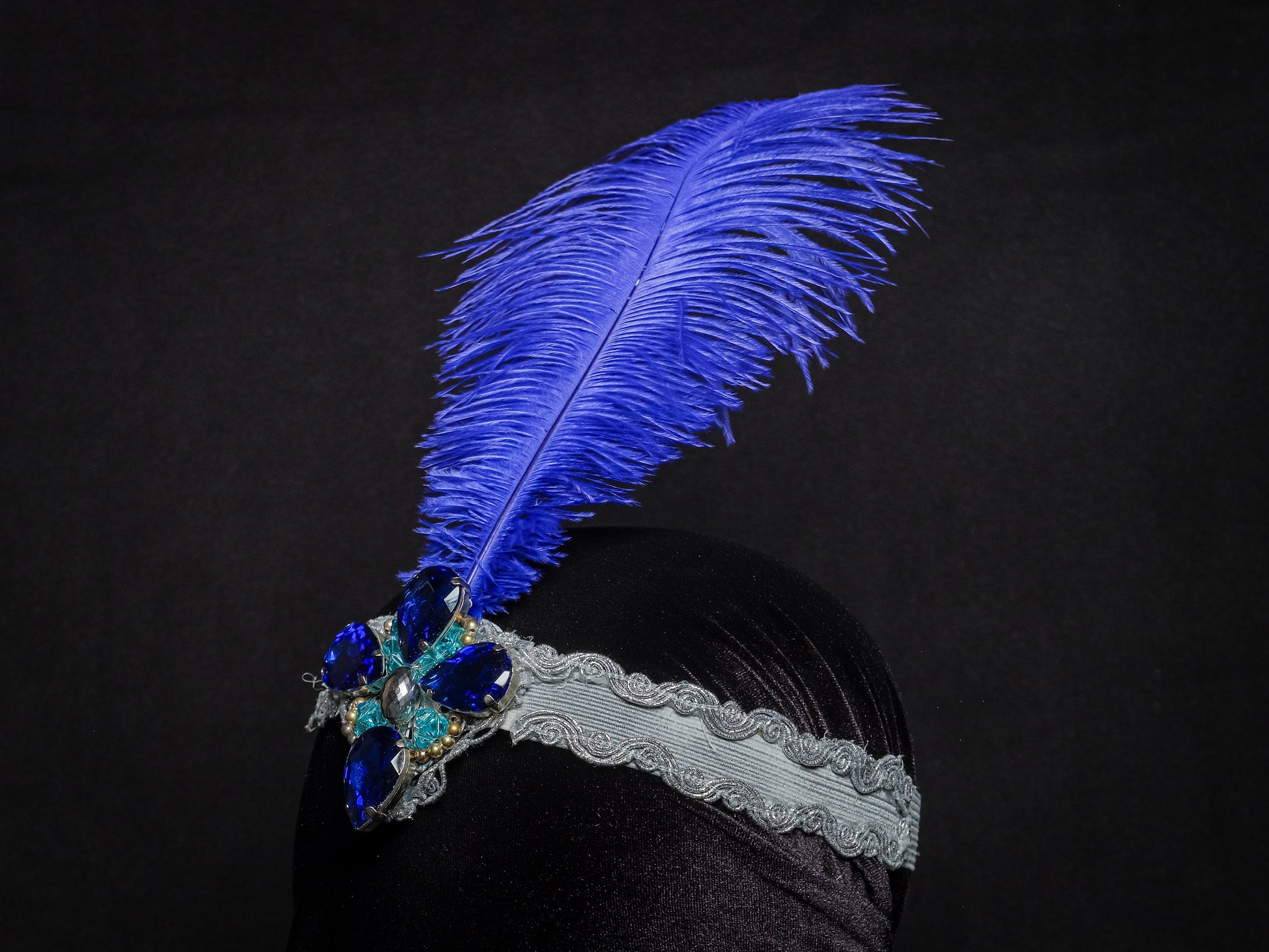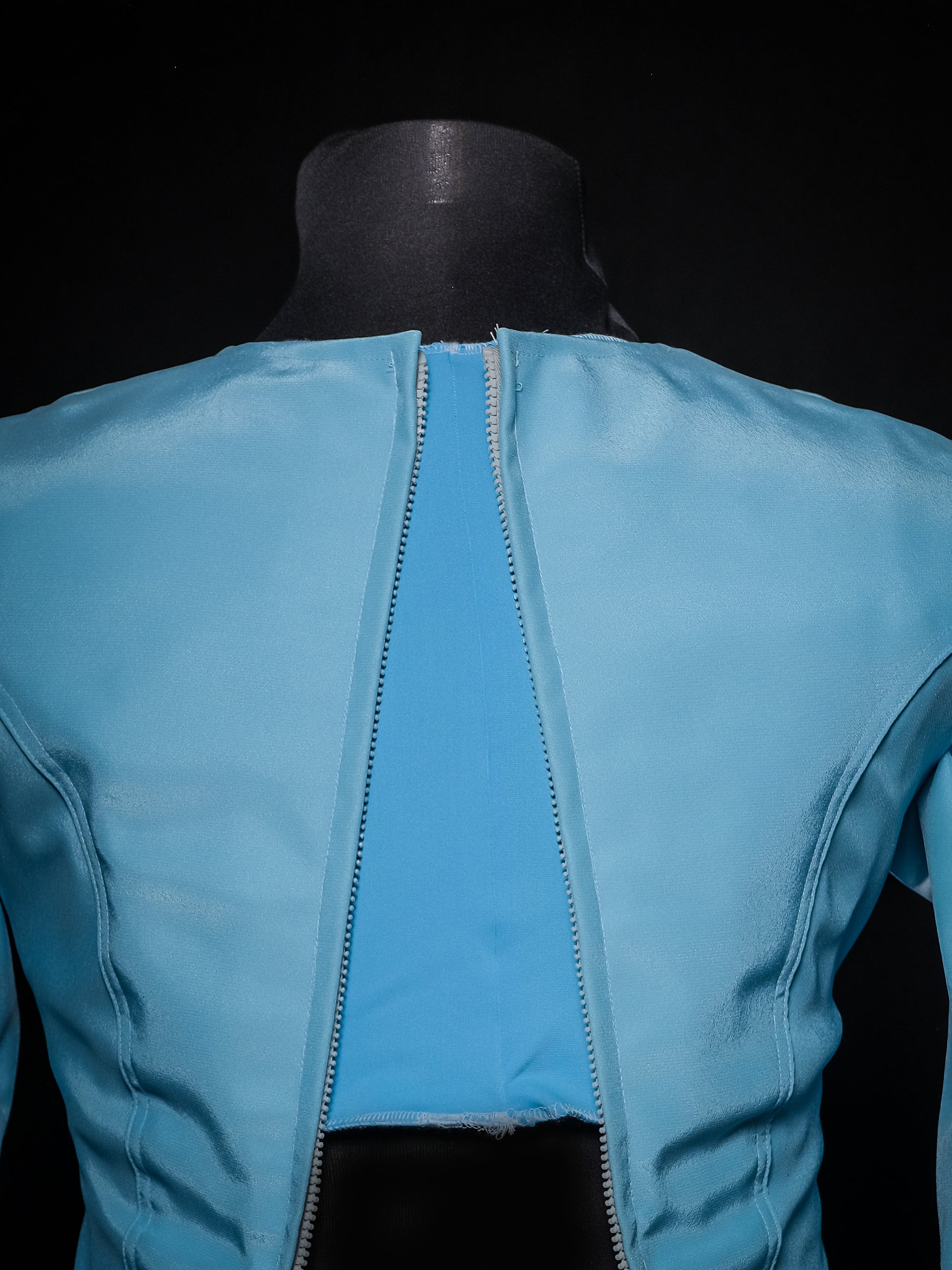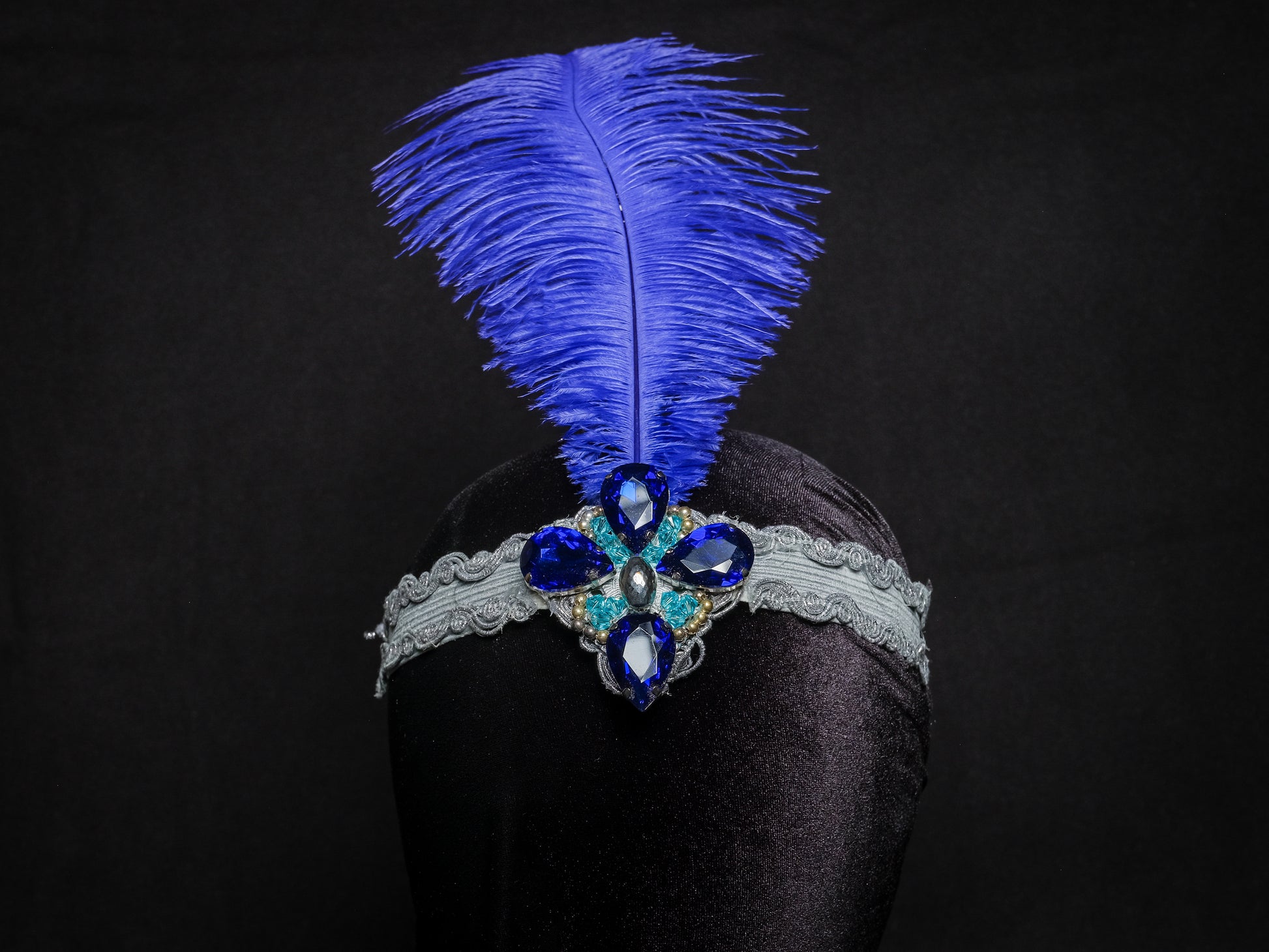 A light blue tunic forms the foundation, centered by a plunging front insert embroidered and beaded in a feathered motif that draws the line upward with focus and brightness. Separate sleeves preserve full range of motion and keep the silhouette clean during fast, intricate footwork and jumps. Blue tights and a royal blue feather headpiece is included and completes the look with a touch of vivid, aerial energy.